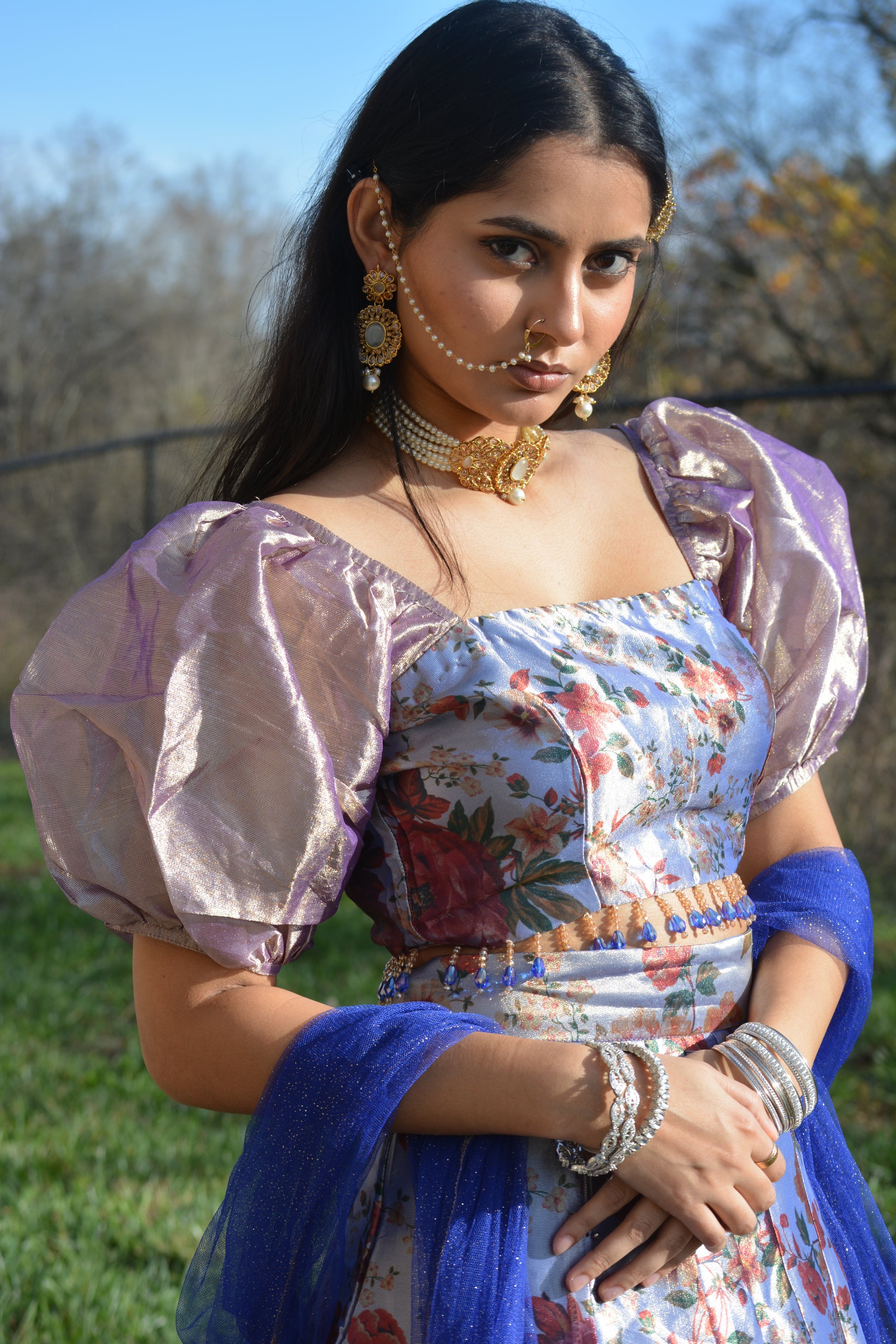 Lavender puff-sleeve blouse with pearl trim